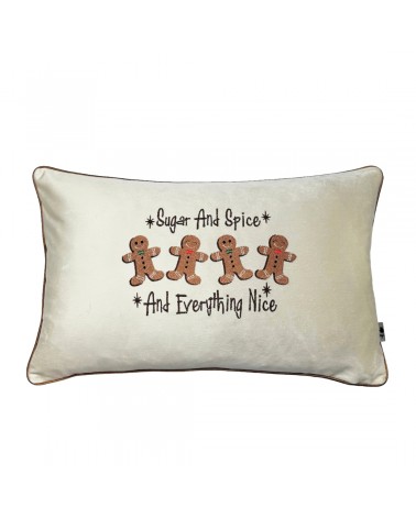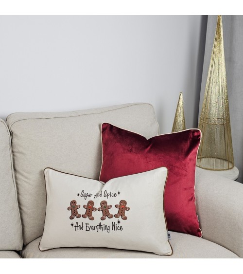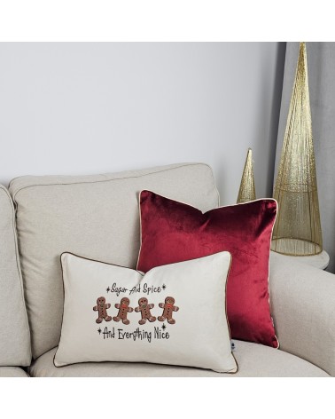 Beżowa, velvetowa poduszka ze światecznym haftem ciasteczek z piernika. Lamówka w kolorze cynamonowym.